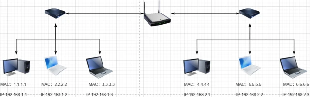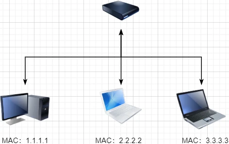 这样连接起来的网络,称为局域网,也可以称为以太网(以太网是局域网的一种)。在这个网络中,我们需要标识每个机器,这样才可以指定要和哪个机器通信。这个标识就是硬件地址MAC。硬件地址随机器的生产就被确定,永久性唯一。在局域网中,我们需要和另外的机器通信时,只需要知道他的硬件地址,交换机就会把我们的消息发送到对应的机器。