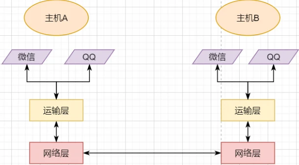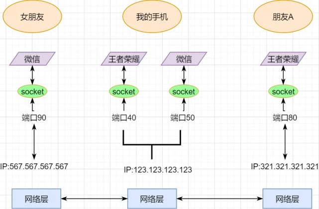 一个主机有多个进程,进程之间进行不同的网络通信,如边和朋友开黑边和女朋友聊微信。我的手机同时和两个不同机器进行通信。那么当我的手机收到数据时,如何区分是微信的数据,还是王者的数据?那么就必须在网络层之上再添加一层:运输层:
