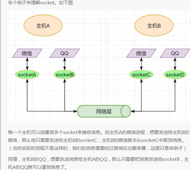不同的运输层协议对socket有不同的定义方式。在UDP协议中,使用目标IP+目标端口号来定义一个socket;在TCP中使用目标IP+目标端口号+源IP+源端口号来定义一个socket。我们只需要在运输层报文的头部附加上这些信息,目标主机就会知道我们要发送给哪个socket,对应监听该socket的进程就可获得信息。