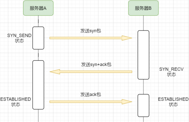 机器A发送syn包向机器B请求建立TCP连接,并附加上自身的接收缓冲区信息等,机器A进入SYN_SEND状态,表示请求已经发送正在等待回复;