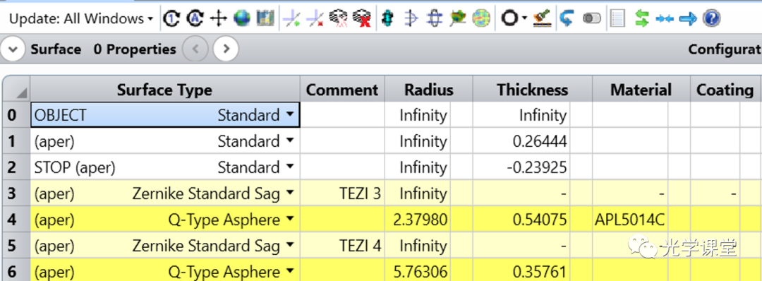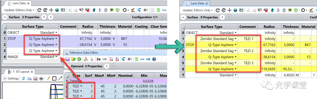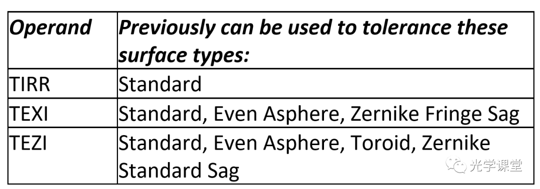 对于使用的表面类型,TIRR操作数将被展开为不规则复合表面。TEXI操作数将被展开为Zernike Fringe Sag复合曲面。而TEZI操作数将被展开为Zernike Standard Sag复合面