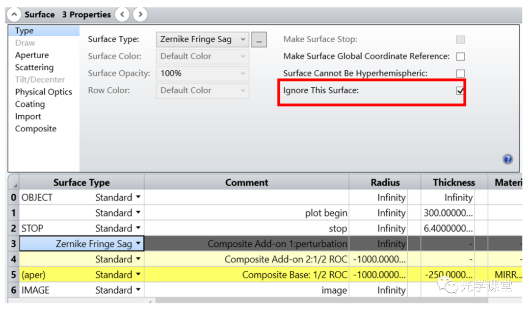 首先,设置面2为叠加矢高的面,打开属性面板,点Composite页,勾选 Add sag to the next surface