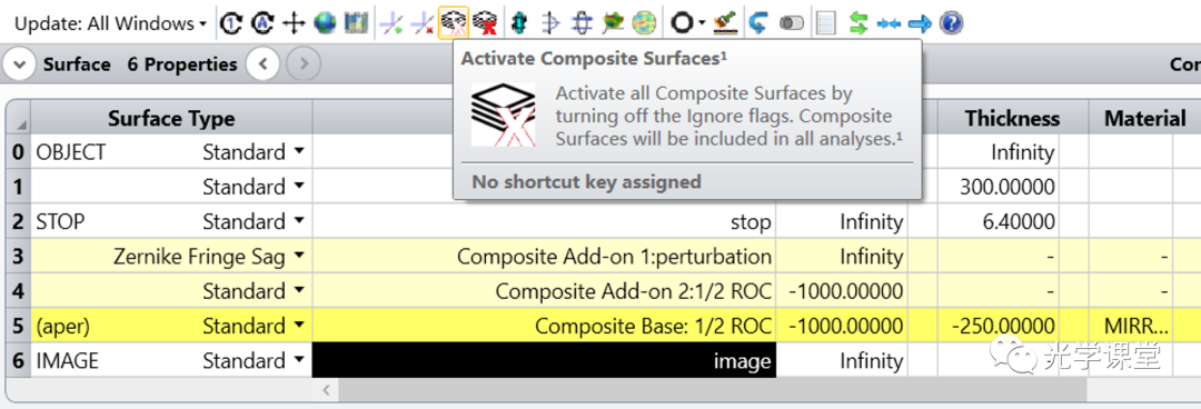 不能为复合附加面设置材料和镀膜,因为它只提供矢高。它的材料和镀膜属性在基面上设置。同时,附加面的孔径跟随基面。