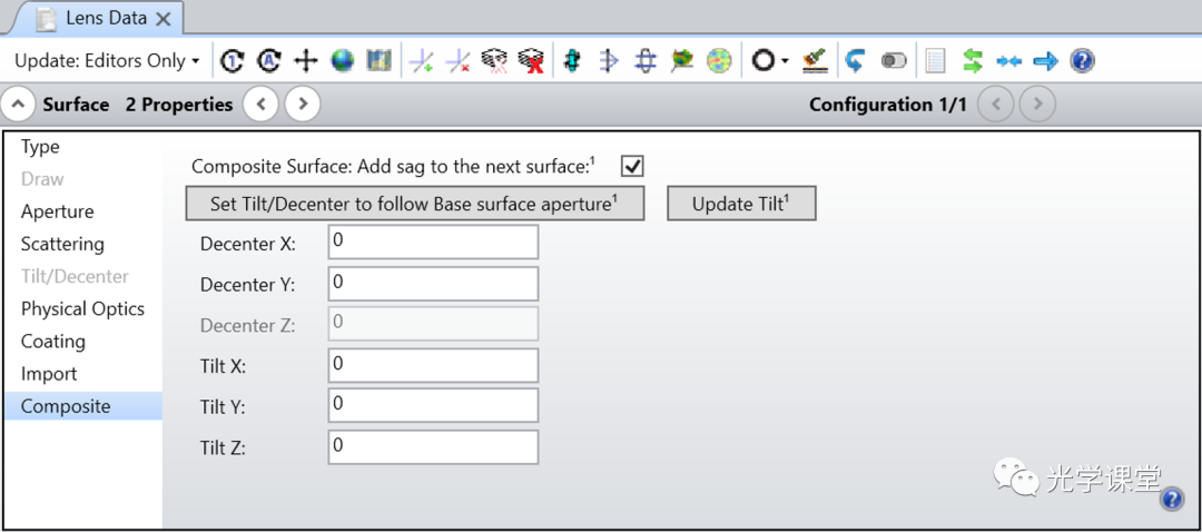 IsCompositeSurface用于该参数的设置和获取值。SetOffAxisTiltAndDecenter()根据离轴表面孔径中心的基础复合表面法向量的计算来填充表面属性。