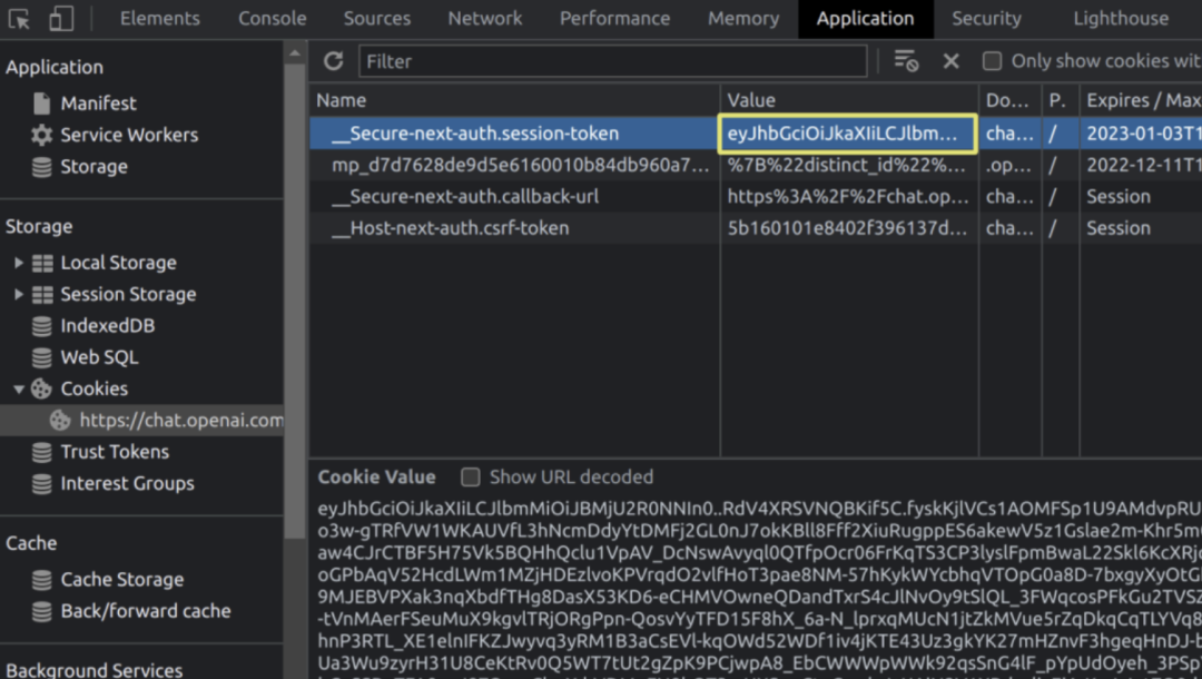 方法为登录ChatGPT网页,点击“开发者工具”,进入Application栏,在Cookie下拉菜单找到chat.openai.com,就能看到Secure-next-auth.session-token的值: