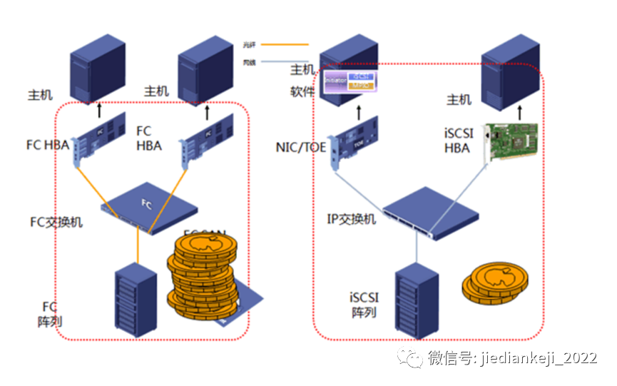 如今的SAN解决方案通常会采取以下两种形式:光纤信道以及iSCSI或者基于IP的SAN,也就是FC SAN和IP SAN。光纤信道是SAN解决方案中大家最熟悉的类型,但是,最近一段时间以来,基于iSCSI的SAN解决方案开始大量出现在市场上,与光纤通道技术相比较而言,这种技术具有良好的性能,而且价格低廉。