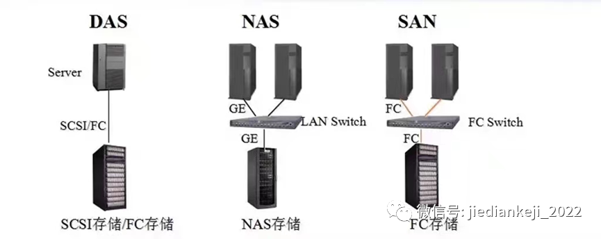 DAS存储一般应用在中小企业,与计算机采用直连方式,SAN存储使用FC接口,供性能更佳的存储,NAS存储则通过以太网添加到计算机上,SAN和NAS的区别主要体现在操作系统在什么位置。