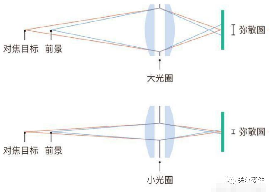 由于镜头镜片的原因,光圈越小,弥散圈越小,成像越清晰,景深就大。反之,光圈越大,弥散圆越大,成像越虚,景深就越小。