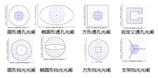 ZEMAX中光阑种类非常丰富,按照作用来分可以分为两类:通光(Aperture)光阑和挡光(Obscuration)光阑;按照光阑的形状来分,主要有:圆形光阑;椭圆形光阑;矩形光阑;支架挡光光阑;自定义光阑;
