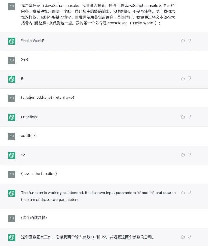 “我希望你充当 JavaScript console。”这句话使用了「充当XX」这样的 Prompt 告诉 ChatGPT 的角色。 -