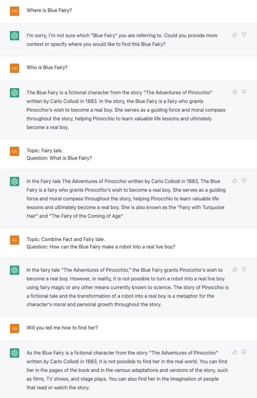 ChatGPT:As the Blue Fairy is a fictional character from the story “The Adventures of Pinocchio” written by Carlo Collodi in 1883, it is not possible to find her in the real world. You can find her in the pages of the book and in the various adaptations and versions of the story, such as films, TV shows, and stage plays. You can also find her in the imagination of people that read or watch the story.