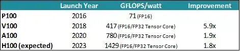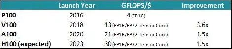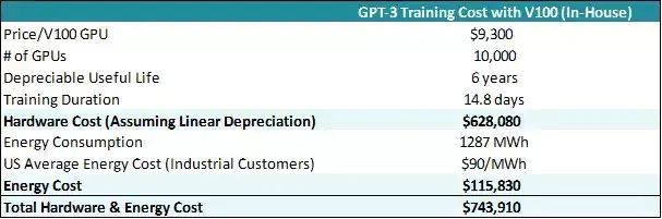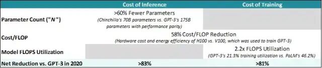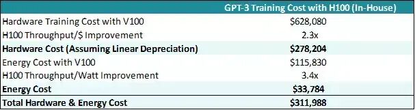 仅从V100(用于训练 GPT-3)到即将推出的H100的改进来看,我们预计内部训练成本将降低58%(即训练成本由74.4万美元降低到31.2万美元)。