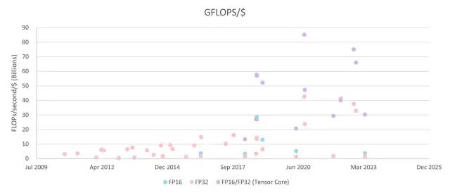 数据中心GPU FP16/FP32吞吐量/美元 (NVIDIA)