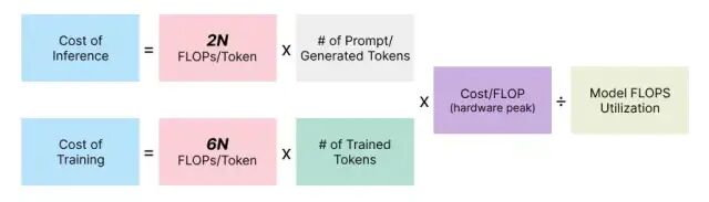 如今,SOTA大型语言模型通常会用到可比较的模型架构(最常见的是仅包含解码器的Transformer模型),在推理过程中每个token的计算成本(以FLOPs为指标)约为2N,其中N为模型参数数量(model parameter count)[14]。