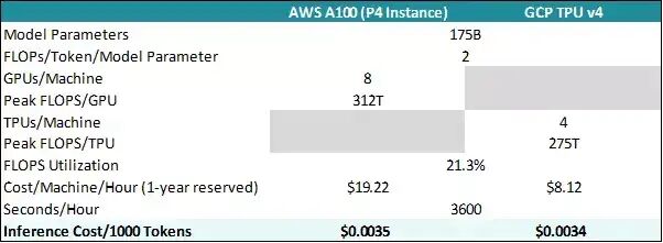 我们也应用了基于GCP TPU v4定价( GCP TPU v4 pricing)相同的计算方法,并得到了相似的结果[19]: