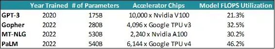 谷歌5400亿参数的PaLM模型在TPU v4芯片上实现了46.2%的模型FLOPS利用率,是GPT-3训练利用率的2.2倍[34]
