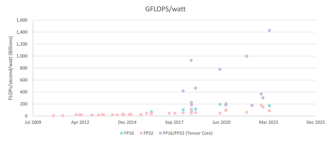 能源效率提升得更快。现在我们可以看到,用于训练LLM的数据中心GPU的代际吞吐量/瓦特提高了80%(或者说年均吞吐量提高了34%):