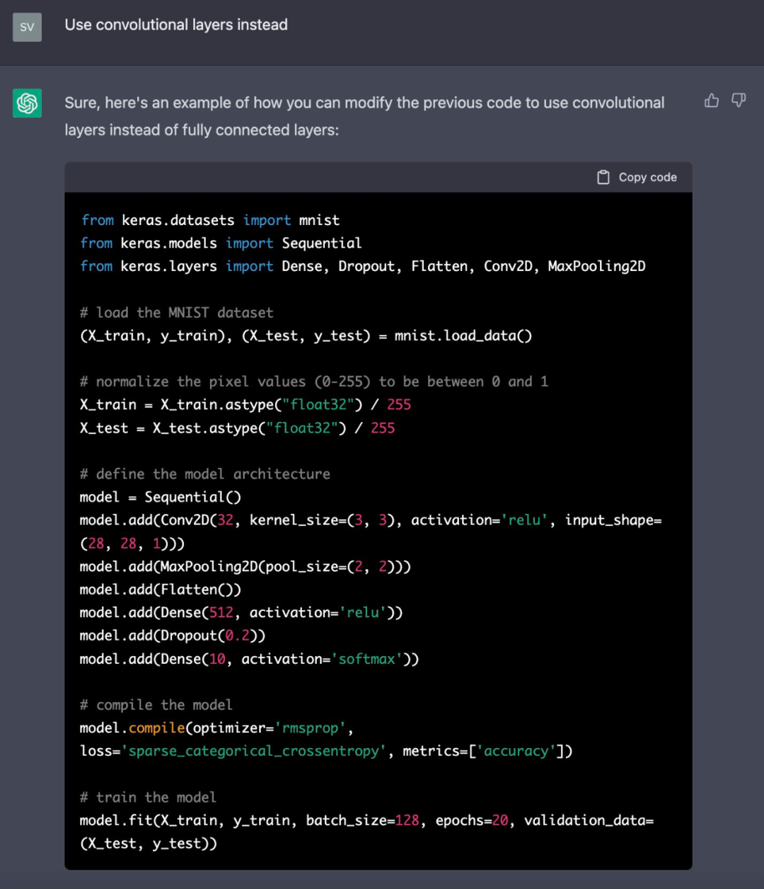 ChatGPT 生成的代码使用了全连接层,但作者想使用卷积层。因此,ChatGPT 按照指示修改了代码,并添加了一个 Conv2D 和一个最大池化层(MaxPooling layer)。