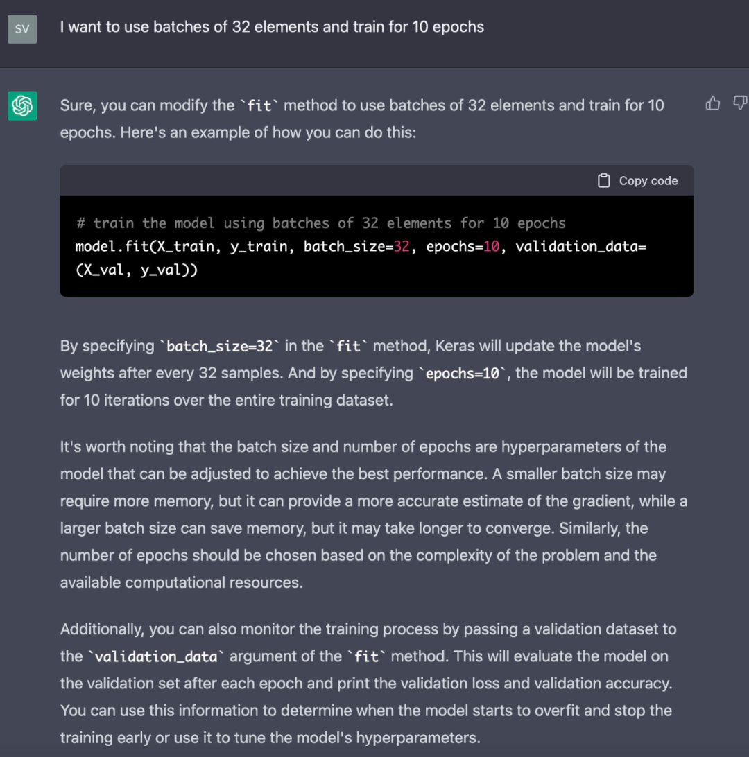 此外,作者还想要更小的 batch 并运行更少 epoch 的代码。虽然这一步未必要用到 ChatGPT,但他不想在不更新 ChatGPT 上下文的情况下更改代码。