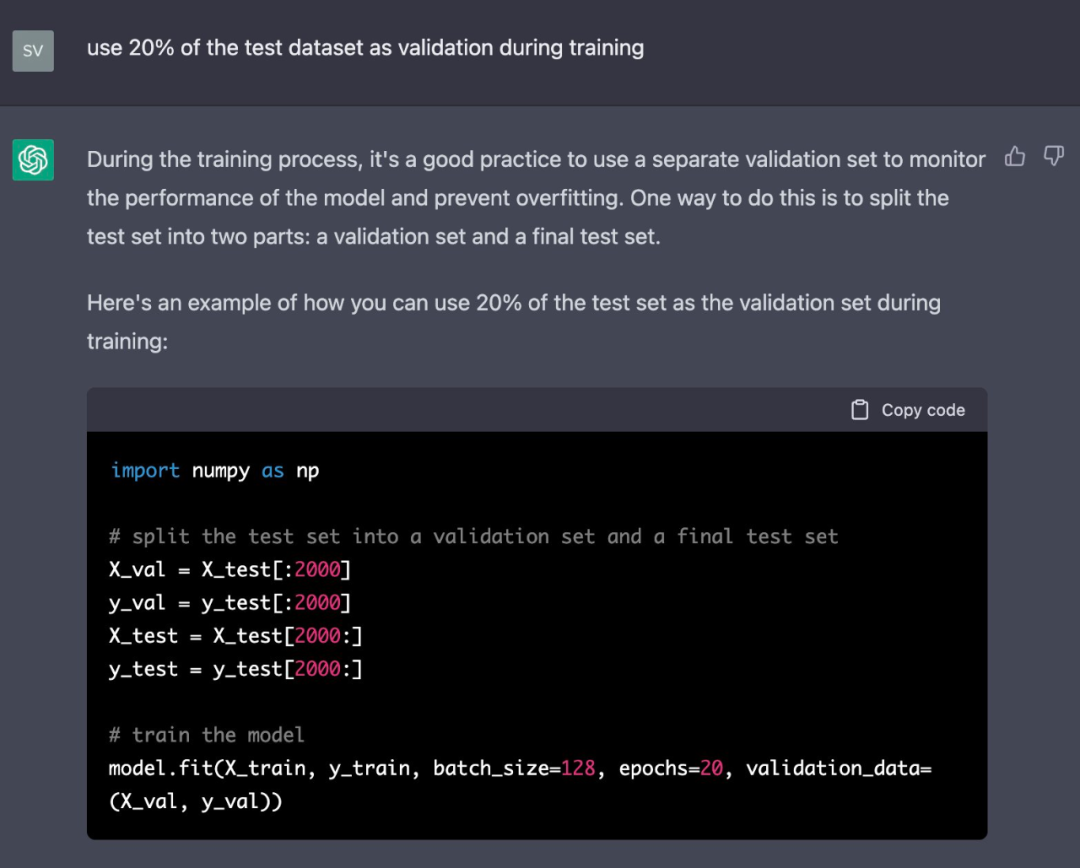 模型在训练期间使用了整个测试集作为验证数据。然后,作者让 ChatGPT 将其更改为训练数据的 20%。