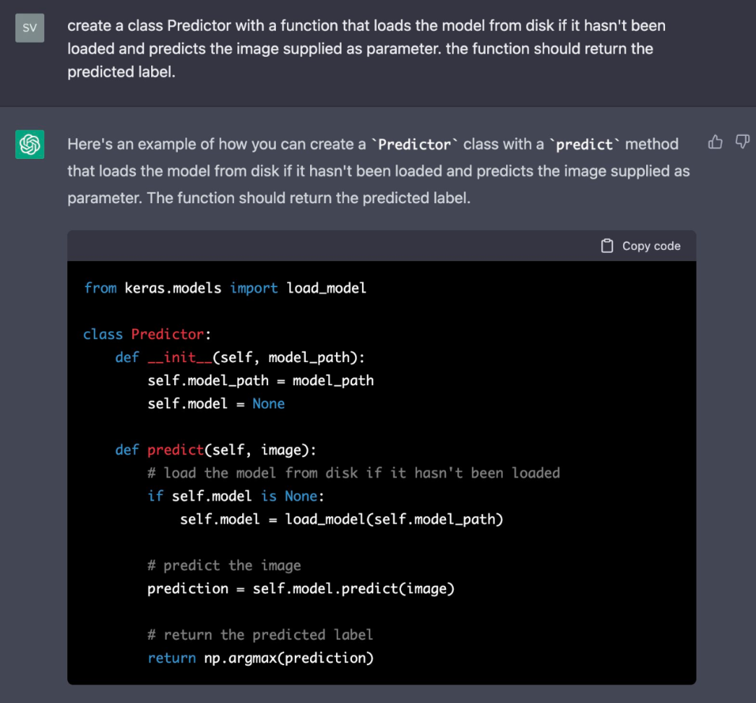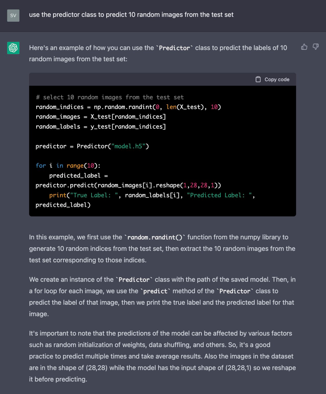 现在,作者想创建一个使用保存的模型进行预测的类。这是 prompt 很有趣,解决方案也很完美。