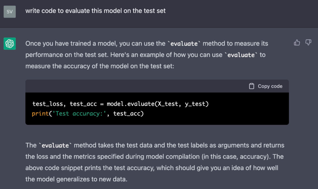 然后来到了评估最终模型阶段,作者让 ChatGPT 使用测试集编写代码。