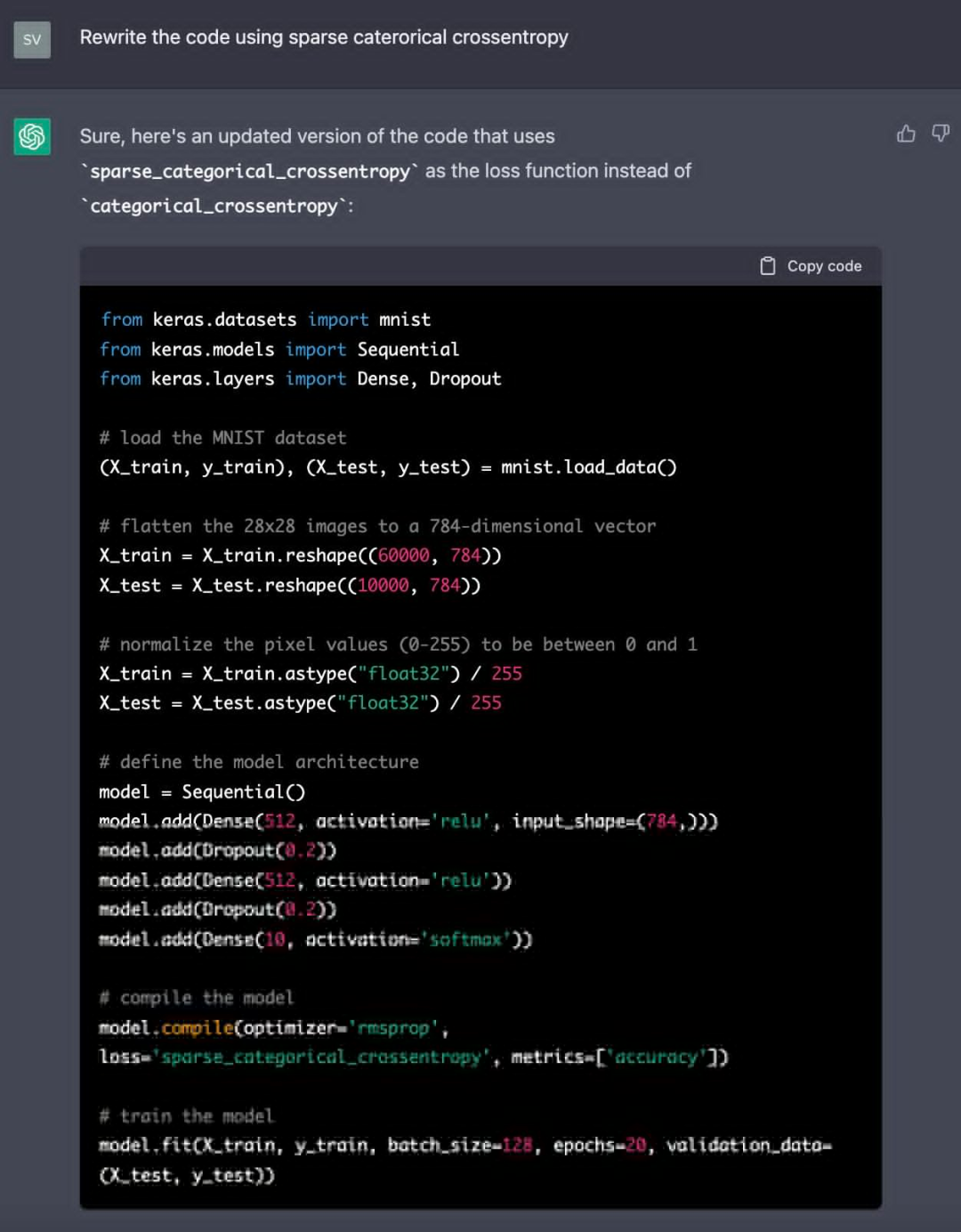 ChatGPT 选择了分类交叉熵作为损失函数。作者提出重写分类交叉熵这部分代码,ChatGPT 将其替换为稀疏分类交叉熵,更新之后的代码仍能 Work。可以发现,新的损失函数放弃了标签的分类转换。