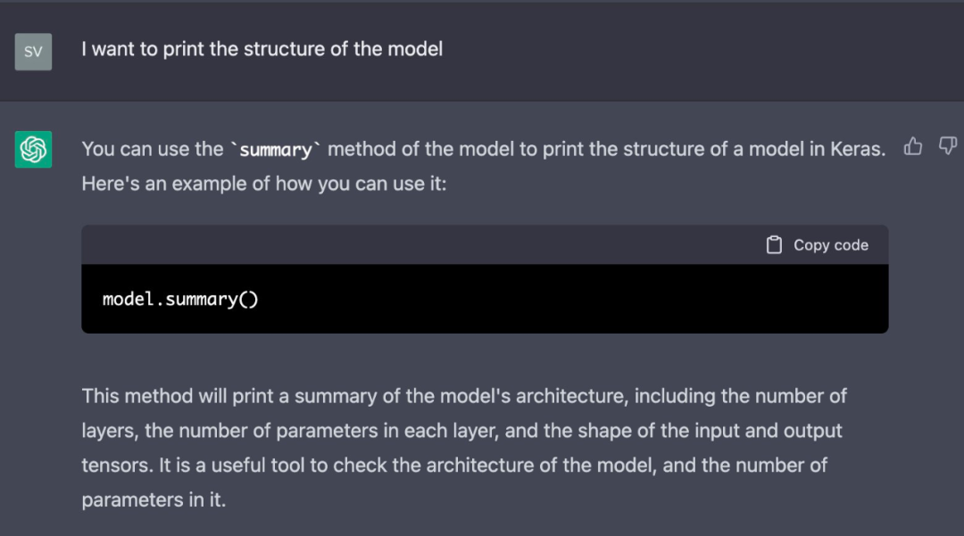 构建模型时,查看其结构也是必要的。如果用这个问题去问 ChatGPT ,回复是: