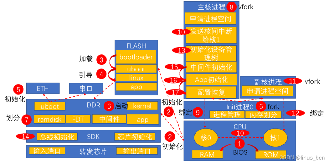 主要完成第一阶段系统的引导和初始化工作,包括序号1~3。系统上电后,首先是cpu开始工作,此时引导程序(通常是汇编代码)从ROM被加载到RAM 中,对cpu的寄存器初始化,启动核0,如果是核1或者其他核则处于休眠状态,等待核0在内核启动正常后通过中断或者事件将其唤醒(图中10的位置)。接下来就是完成flash和ddr初始化,为后面从flash加载bin文件,在DDR中运行程序提供基本环境,一般情况下都是从flash为0的位置,将flash中的bootloader镜像文件加载到RAM或DDR中,该引导程序最终将uboot从flash复制到DDR中,然后交接给uboot进行下一步处理。