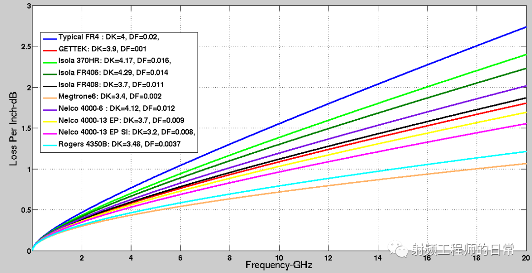 下图是各种介电材料的每一英寸走线长度的PCB走线衰减比较,走线宽度为5 mil,频率最高20 GHz。