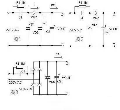 电容降压式简易电源的基本电路如图1,C1为降压电容器,D2为半波整流二极管,D1在市电的负半周时给C1提供放电回路,D3是稳压二极管,R1 为关断电源后C1的电荷泄放电阻。在实际应用时常常采用的是图2的所示的电路。当需要向负载提供较大的电流时,可采用图3所示的桥式整流电路。整流后未经稳压的 直流电压一般会高于30伏,并且会随负载电流的变化发生很大的波动,这是因为此类电源内阻很大的缘故所致,故不适合大电流供电的应用场合。