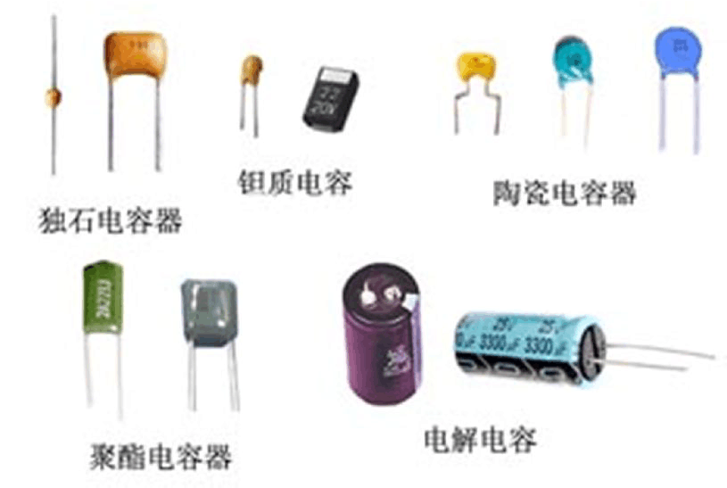 小型电容:金属化纸介电容器、陶瓷电容器、铝电解电容器、聚苯乙烯电容器、固体钽电容器、玻璃釉电容器、金属化涤纶电容器、聚丙烯电容器、云母电容器。