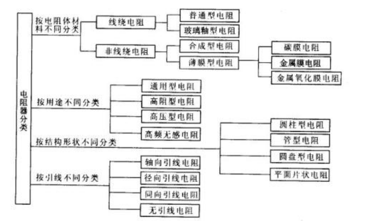 1、电阻的型号命名方法 国产电阻器的型号由四部分组成(不适用敏感电阻) 第一部分:主称 ,用字母表示,表示产品的名字。如R表示电阻,W表示电位器。 第二部分:材料 ,用字母表示,表示电阻体用什么材料组成,T-碳膜、H-合成碳膜、S-有机实心、N-无机实心、J-金属膜、Y-氮化膜、C-沉积膜、I-玻璃釉膜、X-线绕。 第三部分:分类,一般用数字表示,个别类型用字母表示,表示产品属于什么类型。1-普通、2-普通、3-超高频 、4-高阻、5-高温、6-精密、7-精密、8-高压、9-特殊、G-高功率、T-可调。 第四部分 : 序号,用数字表示,表示同类产品中不同品种,以区分产品的外型尺寸和性能指标等 例如:R T 1 1 型普通碳膜电阻 2、电阻器的分类 (1)线绕电阻器:通用线绕电阻器、精密线绕电阻器、大功率线绕电阻器、高频线绕电阻器。 (2)薄膜电阻器:碳膜电阻器、合成碳膜电阻器、金属膜电阻器、金属氧化膜电阻器、化学沉积膜电阻器、玻璃釉膜电阻器、金属氮化膜电阻器。 (3)实心电阻器:无机合成实心碳质电阻器、有机合成实心碳质电阻器。 (4)敏感电阻器:压敏电阻器、热敏电阻器、光敏电阻器、力敏电阻器、气敏电阻器、湿敏电阻器。 3、主要特性参数 (1)标称阻值:电阻器上面所标示的阻值。 (2)允许误差:标称阻值与实际阻值的差值跟标称阻值之比的百分数称阻值偏差,它表示电阻器的精度。允许误差与精度等级对应关系如下:±0.5%-0.05、±1%-0.1(或00)、±2%-0.2(或0)、±5%-Ⅰ级、±10%-Ⅱ级、±20%-Ⅲ级 (3)额定功率:在正常的大气压力90-106.6KPa及环境温度为-55℃~+70℃的条件下,电阻器长期工作所允许耗散的最大功率。 线绕电阻器额定功率系列为(W):1/20、1/8、1/4、1/2、1、2、4、8、10、16、25、40、50、75、100、150、250、500 非线绕电阻器额定功率系列为(W):1/20、1/8、1/4、1/2、1、2、5、10、25、50、100 (4)额定电压:由阻值和额定功率换算出的电压。 (5)最高工作电压:允许的最大连续工作电压。在低气压工作时,最高工作电压较低。 (6)温度系数:温度每变化1℃所引起的电阻值的相对变化。温度系数越小,电阻的稳定性越好。阻值随温度升高而增大的为正温度系数,反之为负温度系数。 (7)老化系数:电阻器在额定功率长期负荷下,阻值相对变化的百分数,它是表示电阻器寿命长短的参数。 (8)电压系数:在规定的电压范围内,电压每变化1伏,电阻器的相对变化量。 (9)噪声:产生于电阻器中的一种不规则的电压起伏,包括热噪声和电流噪声两部分,热噪声是由于导体内部不规则的电子自由运动,使导体任意两点的电压不规则变化。 4、电阻器阻值标示方法 (1)直标法:用数字和单位符号在电阻器表面标出阻值,其允许误差直接用百分数表示,若电阻上未注偏差,则均为±20%。 (2)文字符号法:用阿拉伯数字和文字符号两者有规律的组合来表示标称阻值,其允许偏差也用文字符号表示。符号前面的数字表示整数阻值,后面的数字依次表示第一位小数阻值和第二位小数阻值。 表示允许误差的文字符号 (3)数码法:在电阻器上用三位数码表示标称值的标志方法。数码从左到右,第一、二位为有效值,第三位为指数,即零的个数,单位为欧。偏差通常采用文字符号表示。 (4)色标法:用不同颜色的带或点在电阻器表面标出标称阻值和允许偏差。国外电阻大部分采用色标法。 黑-0、棕-1、红-2、橙-3、黄-4、绿-5、蓝-6、紫-7、灰-8、白-9、金-±5%、银-±10%、无色-±20% 当电阻为四环时,最后一环必为金色或银色,前两位为有效数字, 第三位为乘方数,第四位为偏差。 当电阻为五环时,最後一环与前面四环距离较大。前三位为有效数字, 第四位为乘方数, 第五位为偏差。