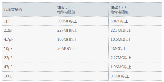 绝缘电阻:指的是常温下,对电容以额定电压值进行充电1分钟/2分钟,将电压值除以1分钟/2分钟的平均漏电流得到绝缘电阻值。 -