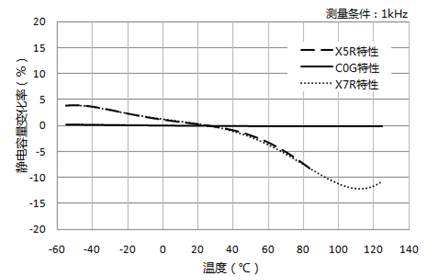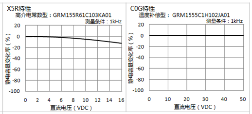 对于温度补偿用电容器 (CH、C0G特性等) ,以常诱电性陶瓷作为主要原料,静电容量不因直流电压特性而发生变化。