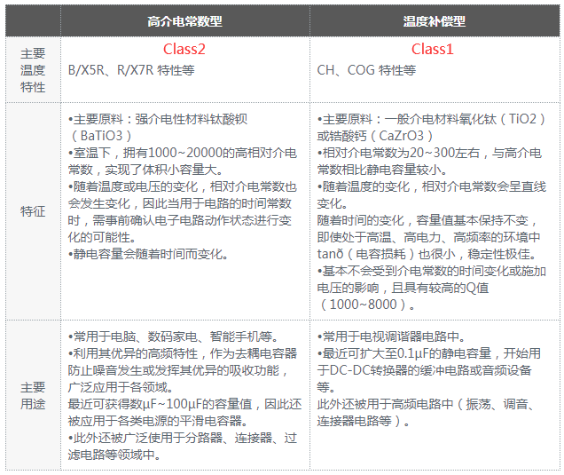 Class1和Class2的介电材料不同,Class1主要是氧化钛,Class2主要是钛酸钡,如下是村田给出的两种对比。