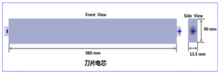 刀片电芯长度是960mm,厚度是 13.5mm,高度为 90 mm,内部结构是叠片。比亚迪电池结构设计借鉴了蜂窝铝板的原理,通过结构胶把电芯固定在两层铝板之间,让电芯本身充当结构件,来增加整个系统的强度。