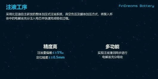 比亚迪自主研发太空舱加压注液技术,先采用真空负压将电池壳体内的空气排空,再用加压方式将电解液充分注入。