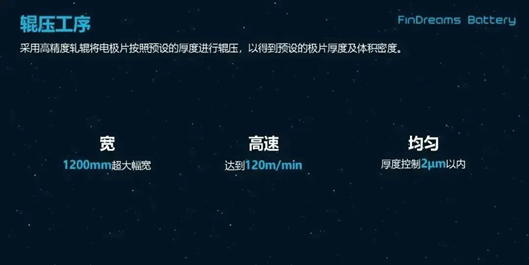 辊压工艺:可以支持120cm超大宽幅,辊压速度达到≥120m/min,厚度控制≥2μm以内,确保宽尺寸极片厚度的一致性。(在120cm宽度下,极片中间部分受力低于两侧,厚度会比两侧高。为此BYD的辊压机还采用了弯缸工艺,对轧辊进行平行度校正,以确保辊压后的极片厚度一致性)