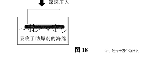 助焊剂请使用非腐蚀性的松香类系列,溶剂请使用化学作用较少的酒精。请薄而均匀地涂抹助焊剂,以防止其浸入继电器内部。对于蘸式涂抹,请保持助焊剂液面稳定。请调整位置使助焊剂不会溢到印制板的上面。请注意不要使助焊剂附着在继电器端子以外的部位,这样可能导致继电器的绝缘降低。请注意对于防尘罩和防焊剂型继电器,不要使用将印制板从上方深深按入蘸有助焊剂的海棉里的涂抹方式,如图 18 所示,这种方式会使助焊剂进入继电器内部。特别要注意的是防尘罩型。