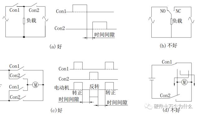 1) 一般继电器的触点间隙都比较小,应考虑到可能由于触点间电弧引起短路的情况。请不要使用图 4(b)的电路。推荐使用图 4(a)所示电路,并在触点 Con1 和 Con2 动作之间设定一定的间隔时间。