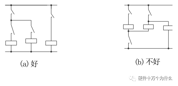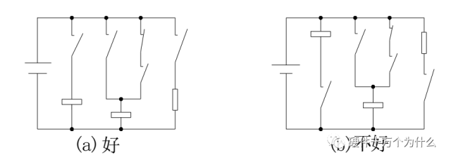 在有多组触点时,请把触点尽量排列在电源的同一极,负载在电源的另一极如图 3(a),这样可以防止触点与触点间存在电压差造成触点间短路的可能。避免象图 3(b)那样边接。