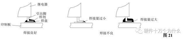 请不要将继电器浸渍在焊剂槽中,这样会使塑料变形导致继电器故障。焊接状态请参考图 21。