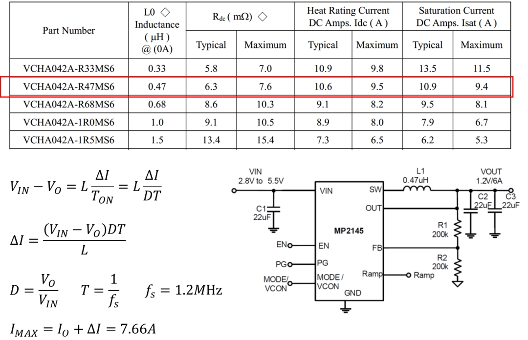 以Buck芯片MP2145为例,可以按照如下公式计算,将计算结果与电感规格值相比较就能判断电感是否会饱和。