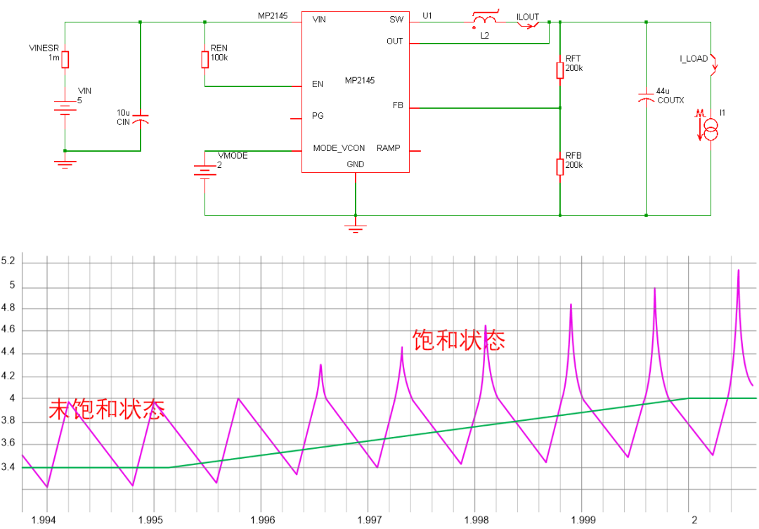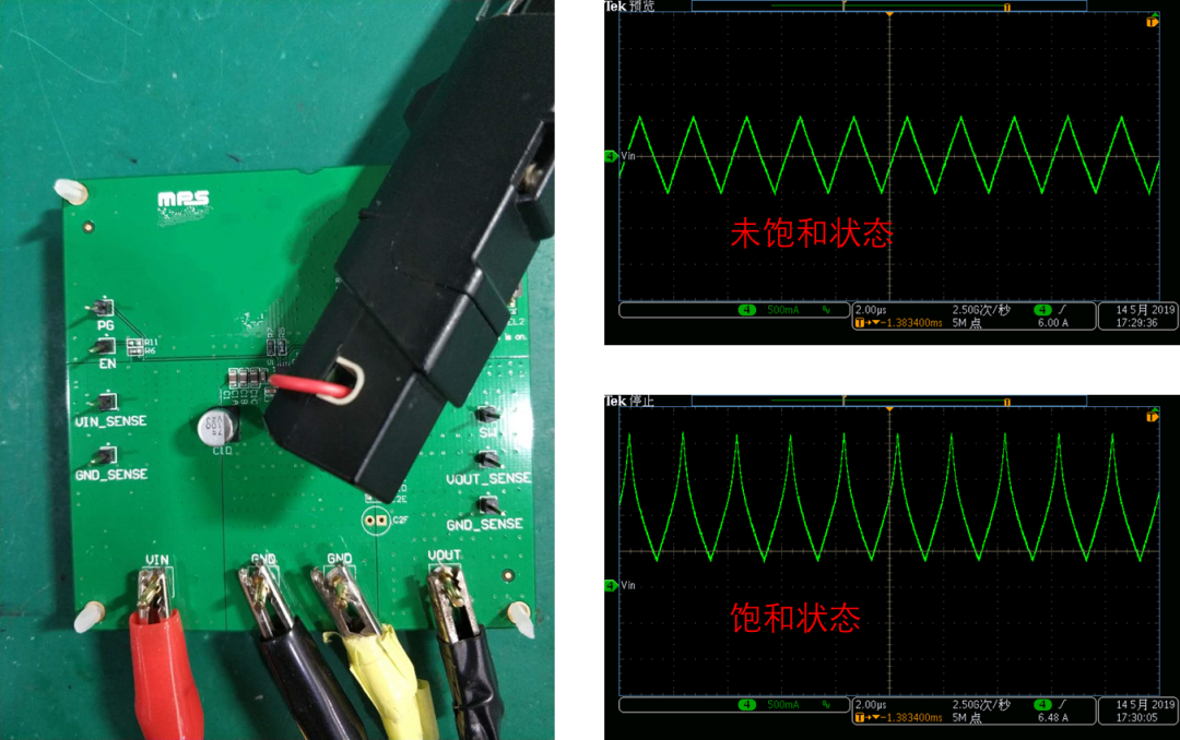 下面是在MP2145 Demo板上实测波形,可以看到饱和后有明显的畸变,与仿真结果一致。