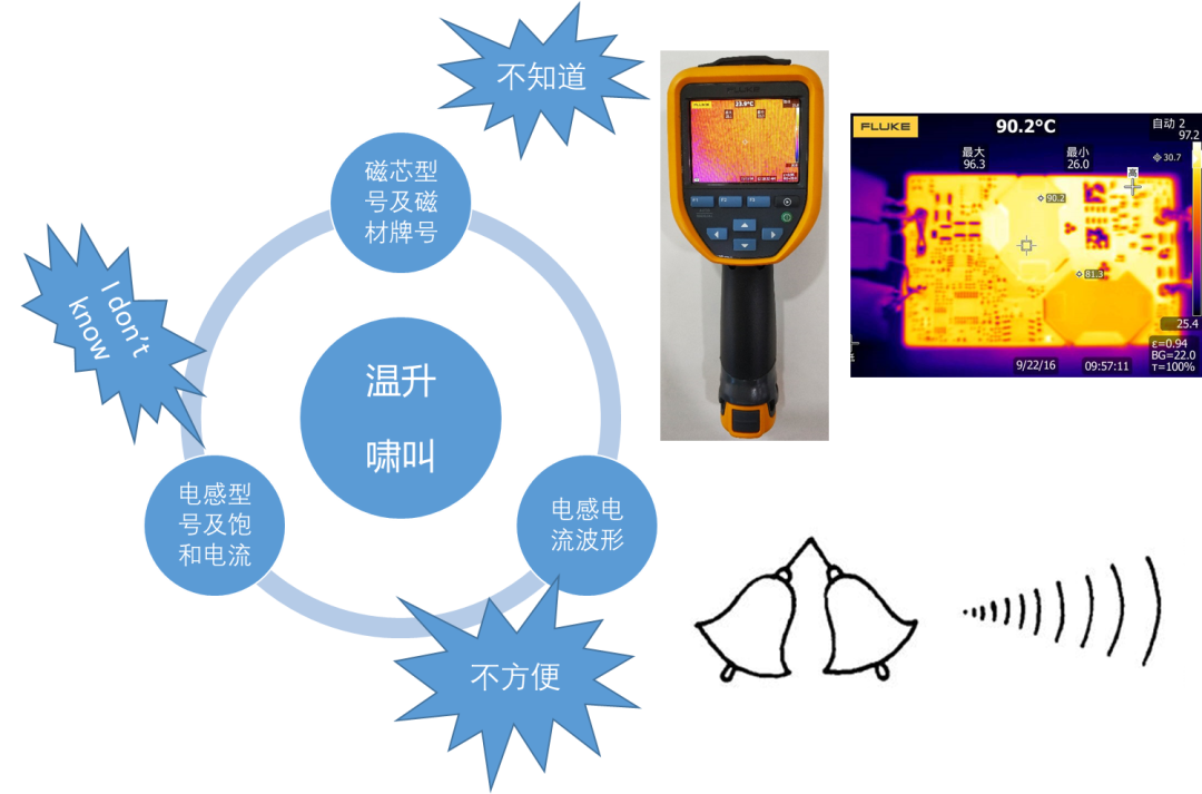 在工程实际中还有很多情况,我们可能不能准确知道磁芯型号,也很难知道电感饱和电流大小,有时候也不能方便的测试电感电流;这时候我们还可以通过测量电感是否有异常温升,或者听是否有异常啸叫等手段来初步判断是否发生了饱和。