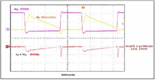 该结果接近于图7 所示测量结果358.7mW。考虑到较大的VF和较长的二极管导通周期,tRR 时间非常短,开关损耗(PSW(DIODE))在二极管损耗中占主导地位。