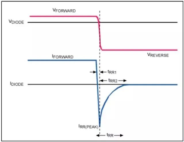 图6. 二极管结反偏时,需要释放正向导通期间的累积电荷,产生峰值电流(IRR(PEAK))