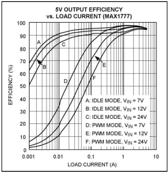 图8. 降压转换器在PWM 和空闲(跳脉冲)模式下效率曲线,注意:轻载时,空闲模式下的效率高于PWM模式