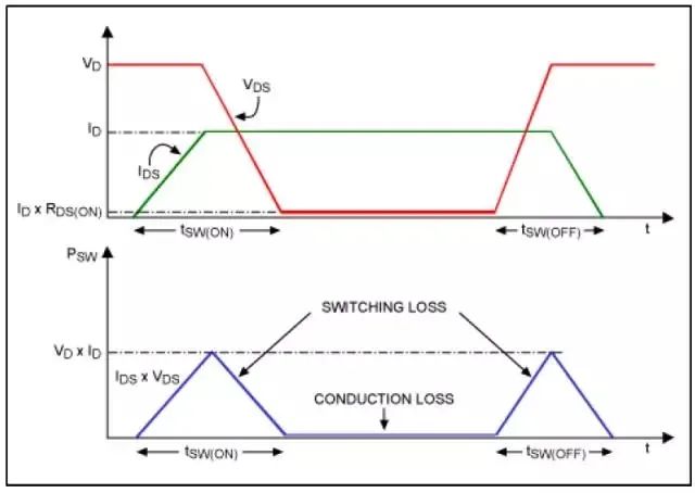 其中,VD 为MOSFET 关断期间的漏源电压,ID 是MOSFET 导通期间的沟道电流,tSW(ON)和tSW(OFF)是导通和关断时间。对于降压电路转换,VIN 是MOSFET 关断时的电压,导通时的电流为IOUT。